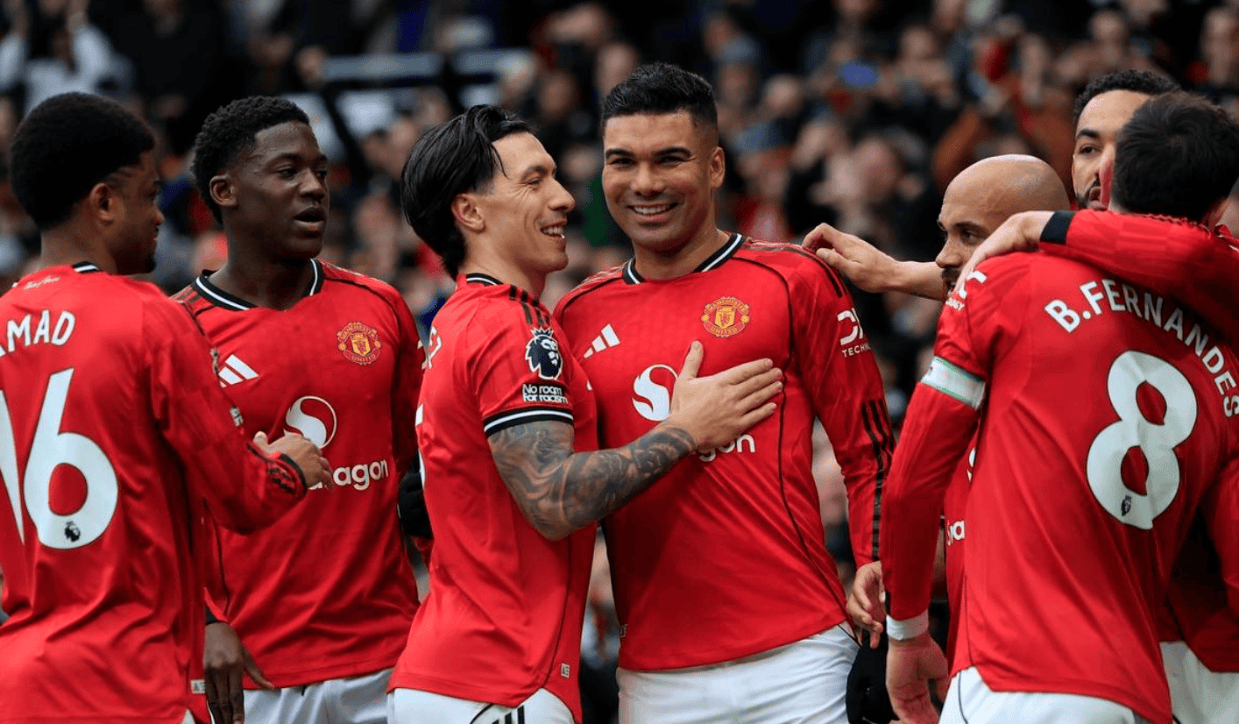 比赛刚刚开始不久,曼联就创造出机会。阿马德在右侧内切兜射远角,被扑了出去。第13分钟,曼联差一点丢球,幸好门将反应极快,在门线伸手挡出了必进球。5分钟后,库尼亚被放倒,裁判判罚点球,但随后改判为任意球。布鲁诺-费尔南德斯主罚,他把球罚进禁区,卡塞米罗抢点头球攻门,球进了!曼联取得领先。